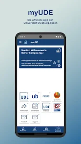 myUDE是杜伊斯堡-埃森大学的官方校园应用。该应用于2022年4月推出,作为由信息和媒体服务中心主导的Campus-App.nrw项目的一部分,旨在为多所大学的校园应用提供一个名为"universe"的统一框架。